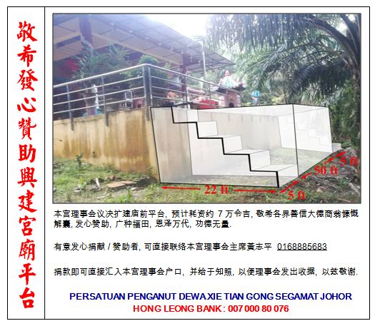 柔佛州昔加挽协天宫 © Copyright 2019 PERSATUAN PENGANUT DEWA XIE TIAN GONG SEGAMAT JOHOR. All rights reserved. 社团注册 : PPM - 016 - 01 - 04052012 VISITOR HITS: